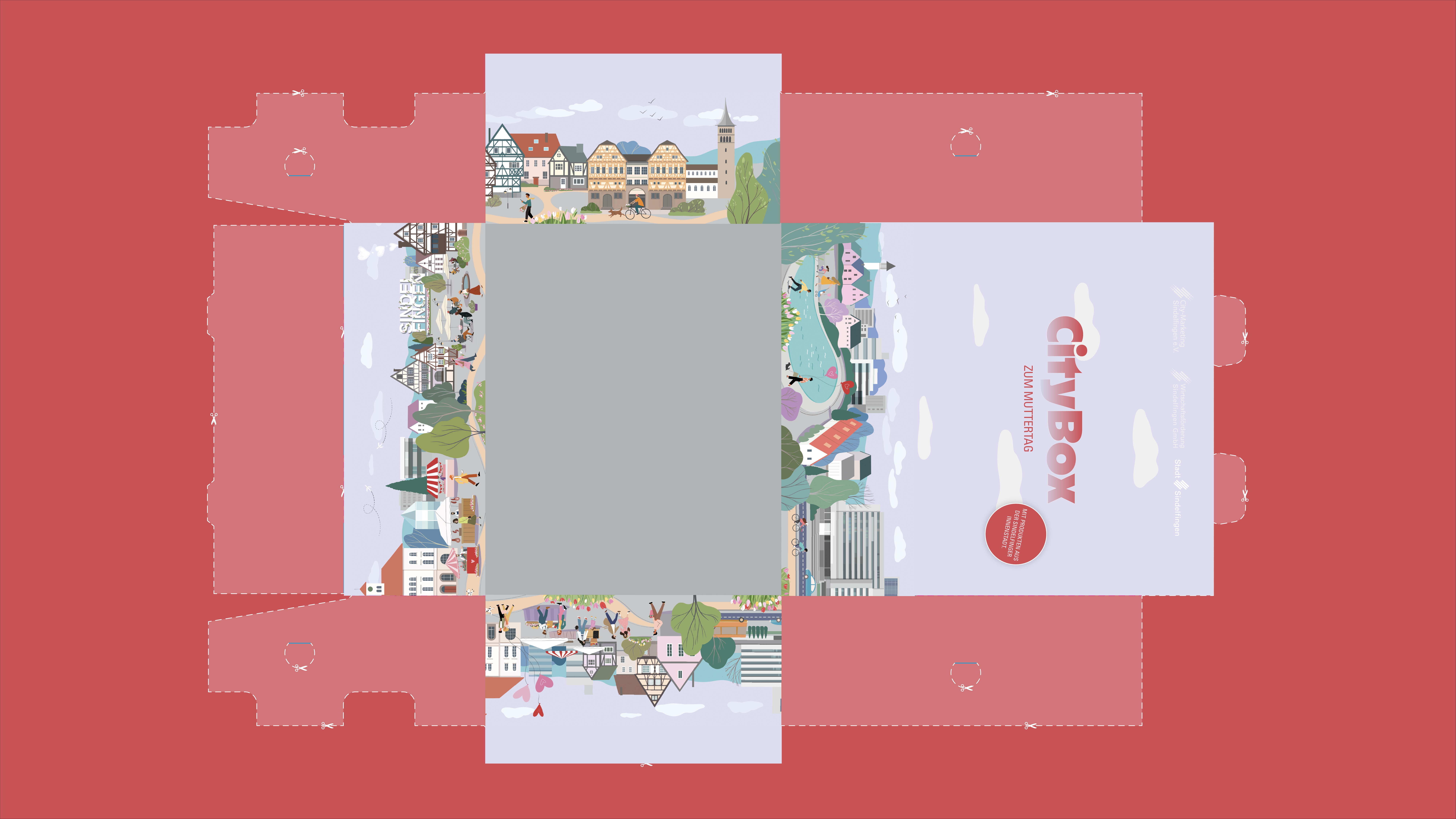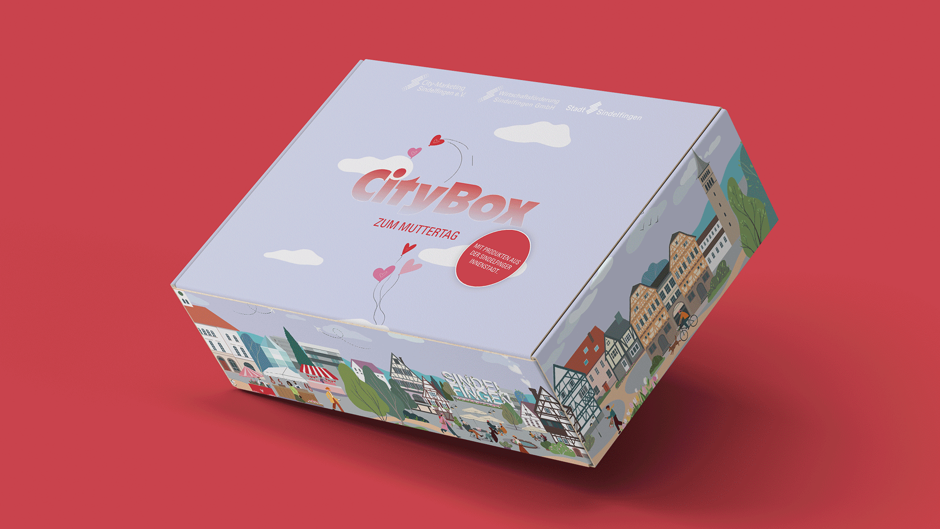 Im Zentrum des Projekts steht die von uns entworfene Gewinnspielbox. Die Illustration zeigt die Stadt Sindelfingen und ist sowohl auf Social Media als auch auf der physischen Box identisch zu sehen. Dadurch entsteht ein klares Wiedererkennungsmerkmal, das die Aktionen unverwechselbar macht.
